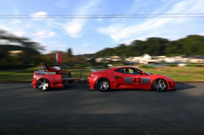 真っ赤な高級スポーツカー「フェラーリ」が、焼き窯をけん引しながら東京都多摩地域西部の日の出町内を走る。