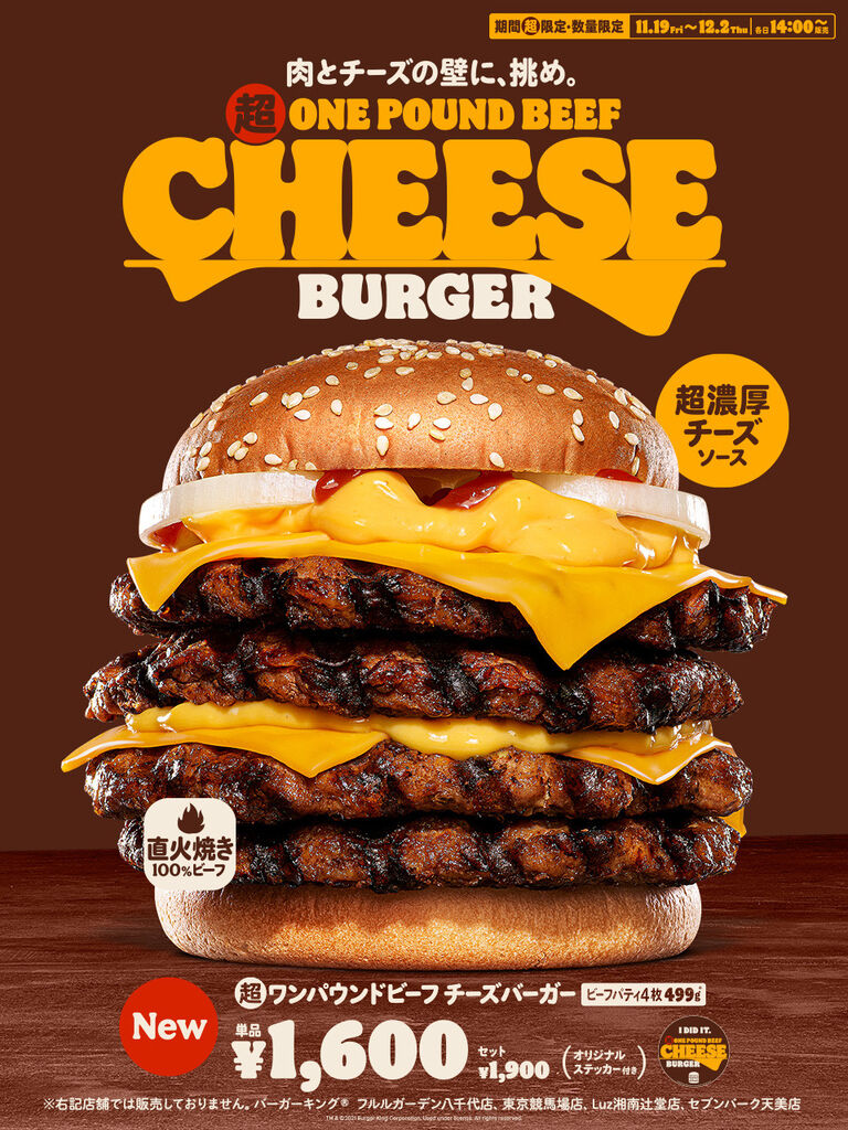 香ばしくジューシーな直火焼きの100%ビーフパティ4枚と、溢れ出る超濃厚チーズの超大型濃厚チーズバーガー!肉とチーズの壁に挑め!