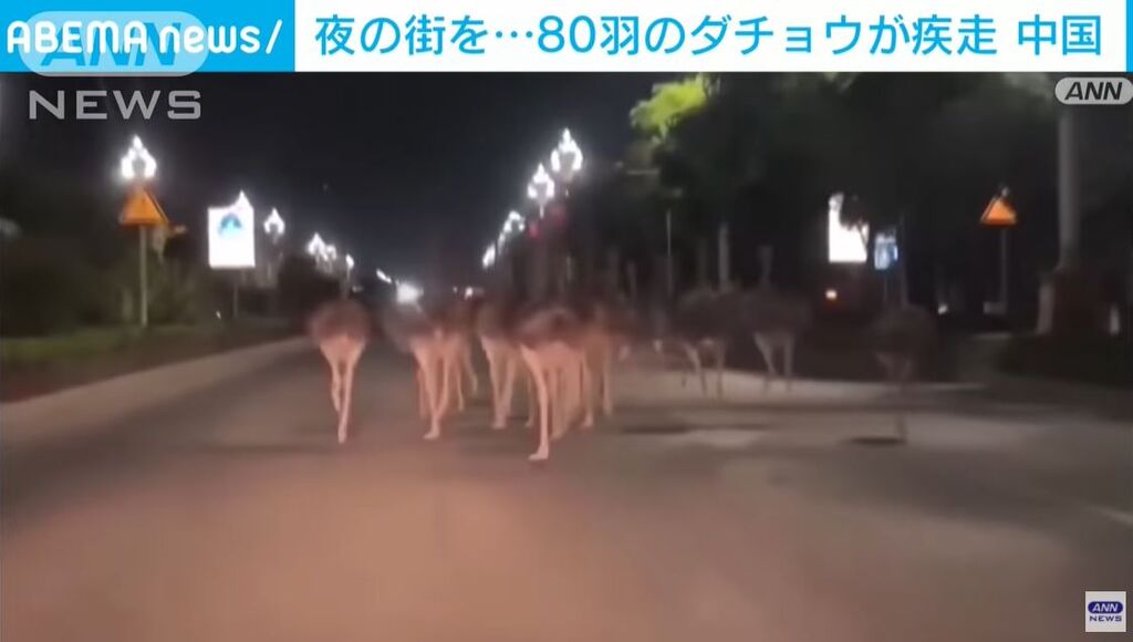 ダチョウが夜の街を疾走したのは中国南部・広西チワン族自治区のベトナムとの国境に近い崇左市です。8日未明、農場で飼育されていた80羽を超えるダチョウがおりから逃げ出し、街中を走り回りました。
