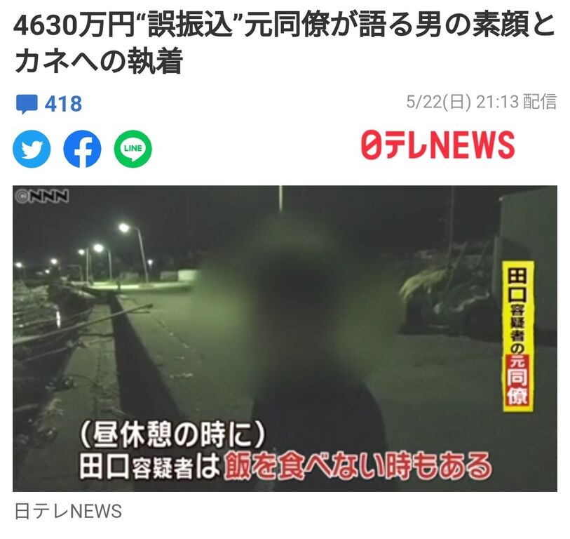 【悲報】田口くん、給料日に金が入るとパチ屋へ出向く依存症だった… 2022/5/23 鈴木さん速報 1: パロスペシャル(SB-Android) [US] 2022/05/23(月) 08:44:18.53 ID:N4/e5CnI0● BE:769643272-2BP(2000) 山口県阿武町が誤って振り込んだ4630万円のうち、400万円を振り替え、不法な利益を得た疑いで逮捕された田口翔容疑者(24)。 2年半前に田口容疑者と同じ職場で働いていたという元同僚を取材すると、入った金はすぐ使う歯止めがきかないタイプだったと語りました。 引用元 続きを読む Source: 鈴木さん速報