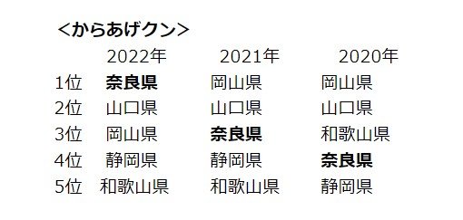 からあげクンを食いまくってるヤバイ県民がこちら 2022/12/29 鈴木さん速報 1: ダークマター(東京都) [ヌコ] 2022/12/28(水) 16:54:46.27 ID:rpoRyu6n0● BE:837857943-PLT(17930) ローソンは全国のローソンおよびナチュラルローソン店舗のPOSデータをもとに、「都道府県別 商品(カテゴリー)の販売高ランキング」を発表した。 「からあげクン」が最も売れた都道府県は「奈良県」(前年3位)だった。 2位は「山口県」(同2位)、3位は「岡山県」(同1位)という結果に。調査を始めた2019年から3年連続で1位を獲得していた 岡山県が3位に順位を落とした。 引用元 続きを読む Source: 鈴木さん速報