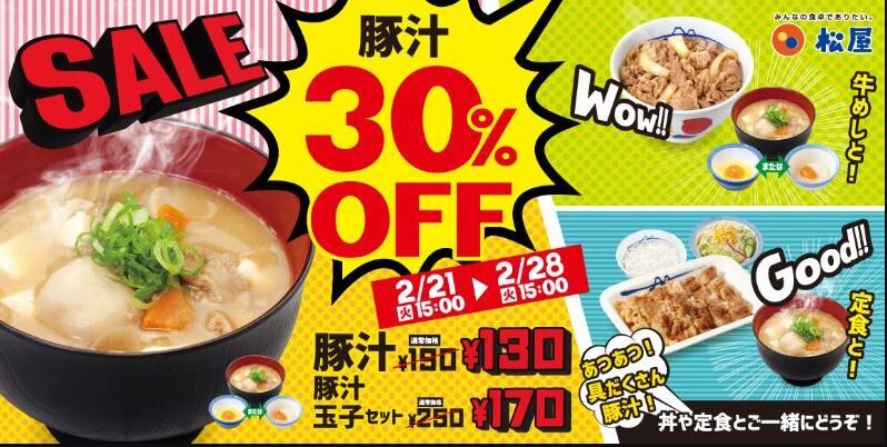 松屋フーズが展開する牛丼チェーン「松屋」は2月21日15時、一部を除く全国の店舗で「豚汁30%OFFキャンペーン」を開始する。開催期間は2月28日15時までの1週間。