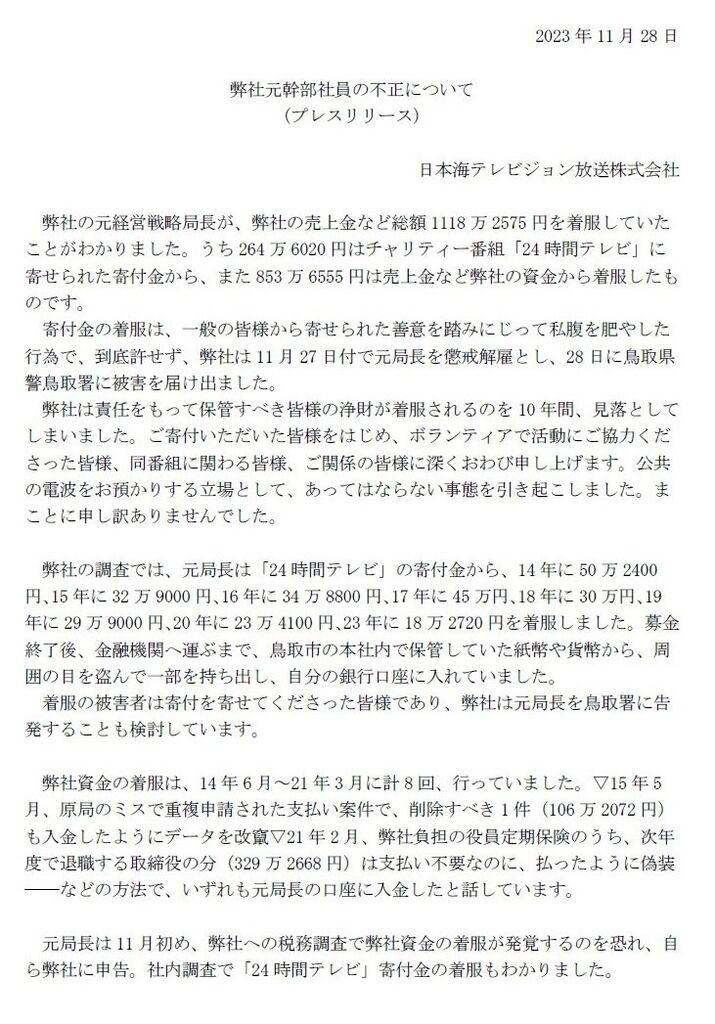 【悲報】24時間テレビで横領した寄付金は後輩への奢りとパチスロに使われていたwww 2023/11/28 鈴木さん速報 1: それでも動く名無し 2023/11/28(火) 15:06:40.21 ID:1waq8/cMa 終わりやね 続きを読む Source: 鈴木さん速報