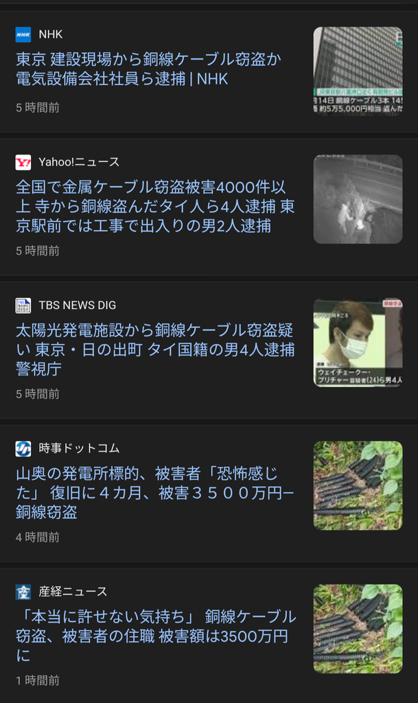日本、闇バイトの次は「銅線ケーブル泥棒」が大流行。ありがとう自民党… 2024/10/18 鈴木さん速報 1: それでも動く名無し 警備員[Lv.4] 2024/10/18(金) 17:28:59.65 ID:5mZkOu7L0 ほんま治安おわったな 続きを読む Source: 鈴木さん速報