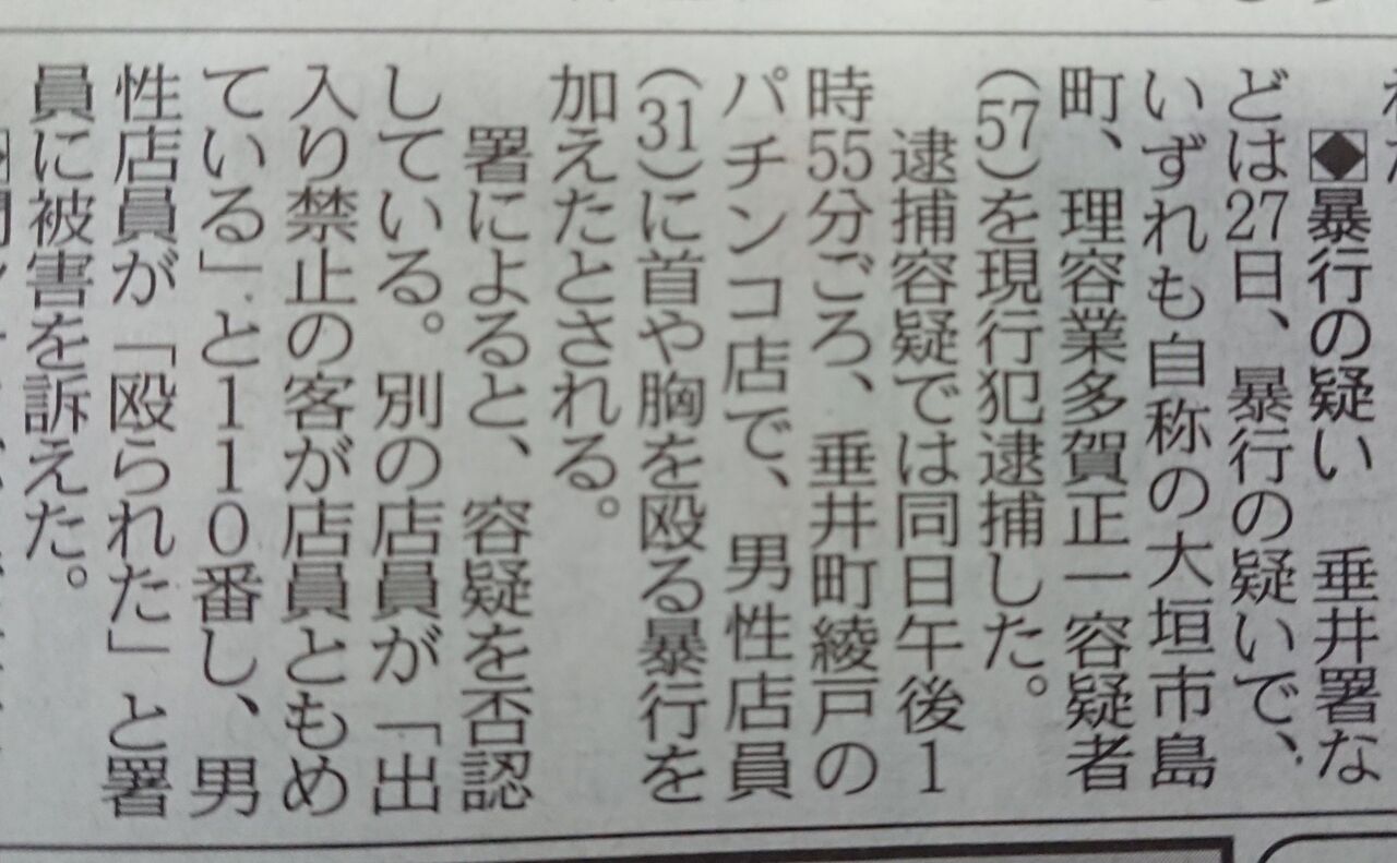 逮捕容疑では同日午後1時55分ごろ、垂井町綾戸のパチンコ店で、男性店員(31)に首や胸を殴る暴行を加えたとされる。