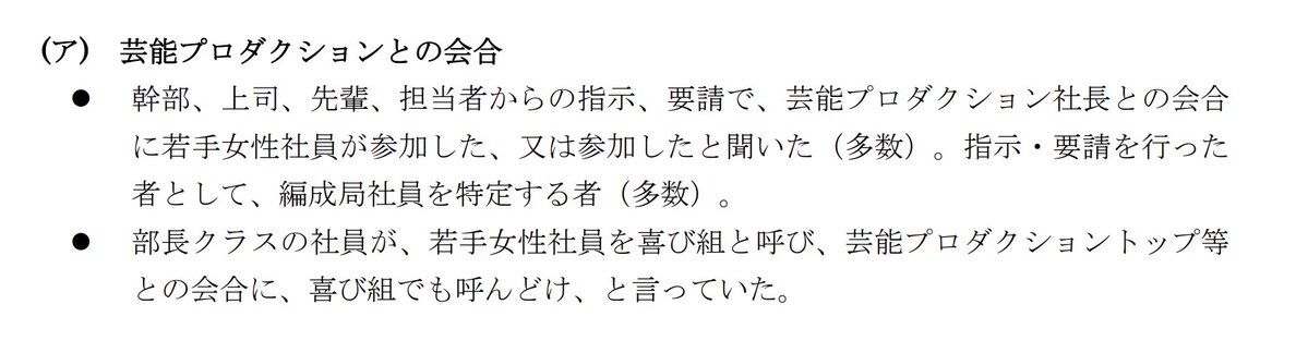 ・部長クラスが若手女性社員を「喜び組」と呼び芸能プロダクション社長との会合に連れて行く