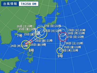 台風7号は、24日(木)午後9時現在、久米島の南南東約40キロにあって、時速20キロで北北西へ進んでいます。この台風は今後、進路を西よりに変え、25日(金)未明にかけて沖縄に最も接近する見込みです。