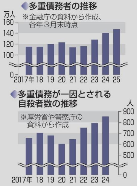 【謎】日本で多重債務者が増えてる理由って物価高の影響?パチンコのせい?ギャンブル? 2025/12/10 鈴木さん速報 1: シャチ ★ 2025/12/08(月) 02:24:28.98 ID:SJBq8ROl9 3件以上の業者から借金する多重債務者が今年3月末時点で147万人に急増し、金融庁が実態解明に向け要因を分析する調査に12月中にも乗り出すことが6日、分かった。 物価高が影響した恐れがあり、深刻化が懸念される。同時に複数業者へ申し込む総量規制すり抜けが横行している疑いがあり、業者への聞き取りを視野に入れる。使途確認を強化する監督指針改正も検討する。 引用元 多重債務者の推移、多重債務が一因とされる自○者数の推移 続きを読む Source: 鈴木さん速報