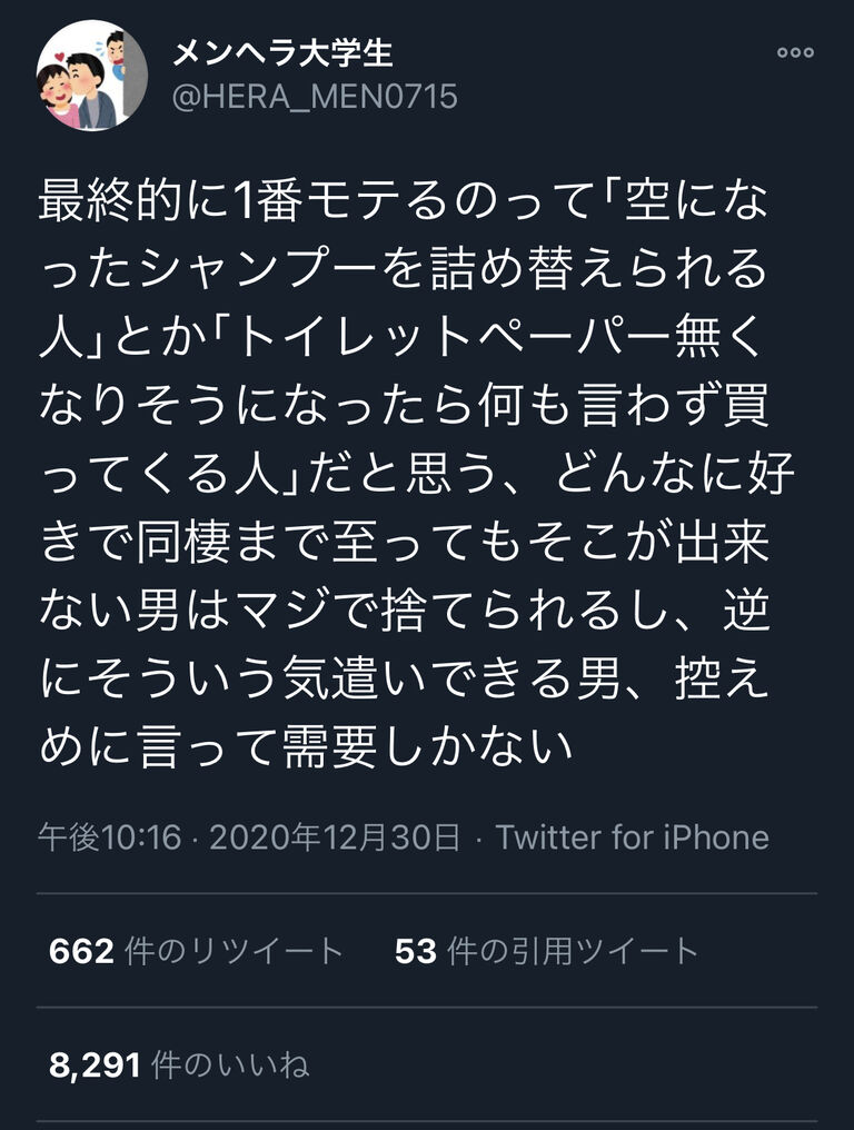 最終的に1番モテるのって「空になったシャンプーを詰め替えられる人」とか「トイレットペーパー無くなりそうになったら何も言わず買ってくる人」だと思う、どんなに好きで同棲まで至ってもそこが出来ない男はマジで捨てられるし、逆にそういう気遣いできる男、控えめに言って需要しかない