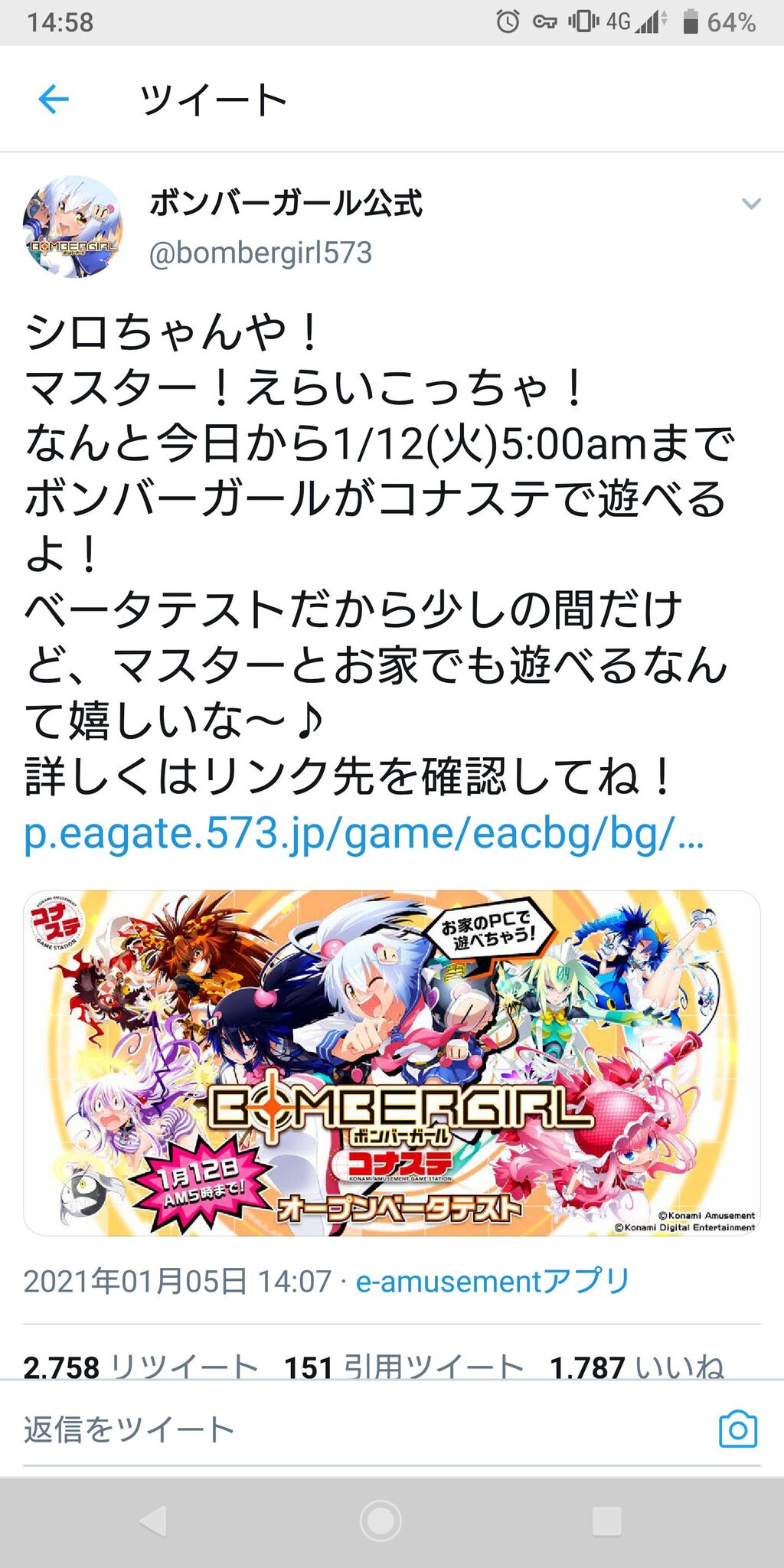 なんと今日から1/12(火)5:00amまでボンバーガールがコナステで遊べるよ!